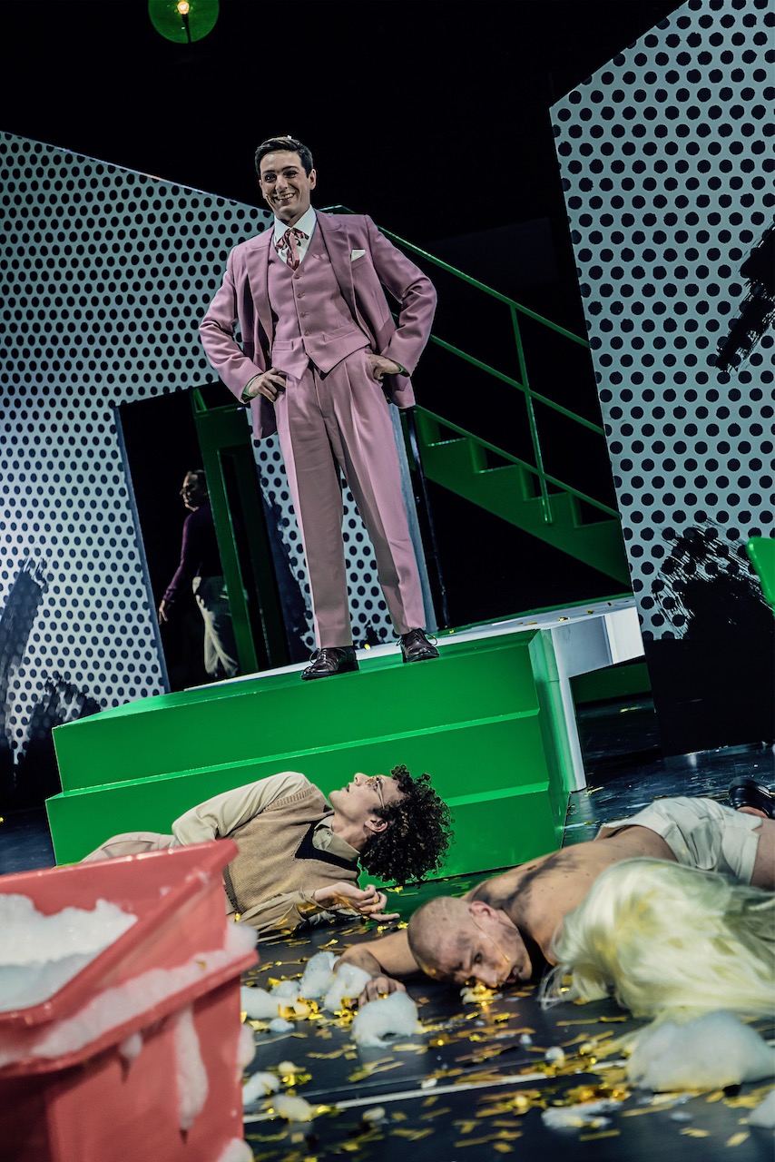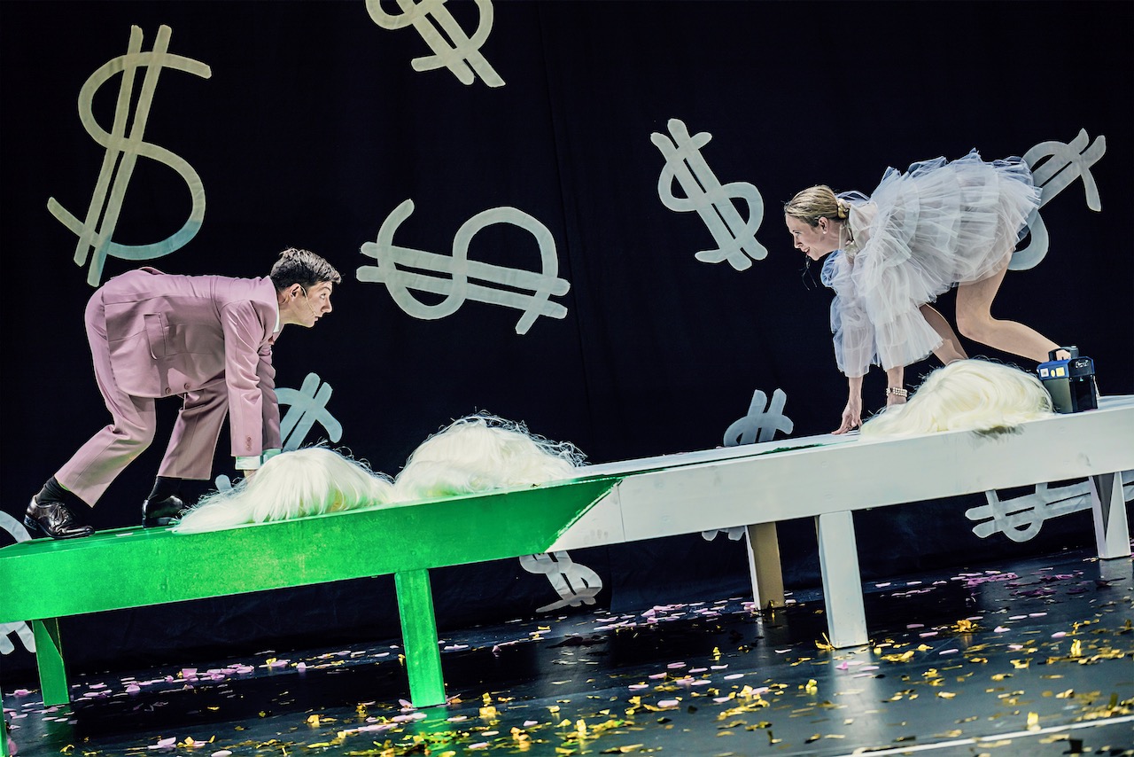 In Matthias Kaschig Inszenierung werden die Grenzen zwischen Bühne und Zuschauern neu ausgehandelt, verschieben sich und lösen sich zeitweise völlig auf. (…) Ein schwarzer Vorhang mit weißen Dollarzeichen setzt gleich den richtigen Ton und stimmt auf die Themen der nächsten zweieinhalb Stunden ein: Kapitalismus, Liebe, Macht, Intrigen und Verderben. Dabei gelingt den Beteiligten ein Balanceakt zwischen opulentem Inhalt und reduzierter Darstellung.